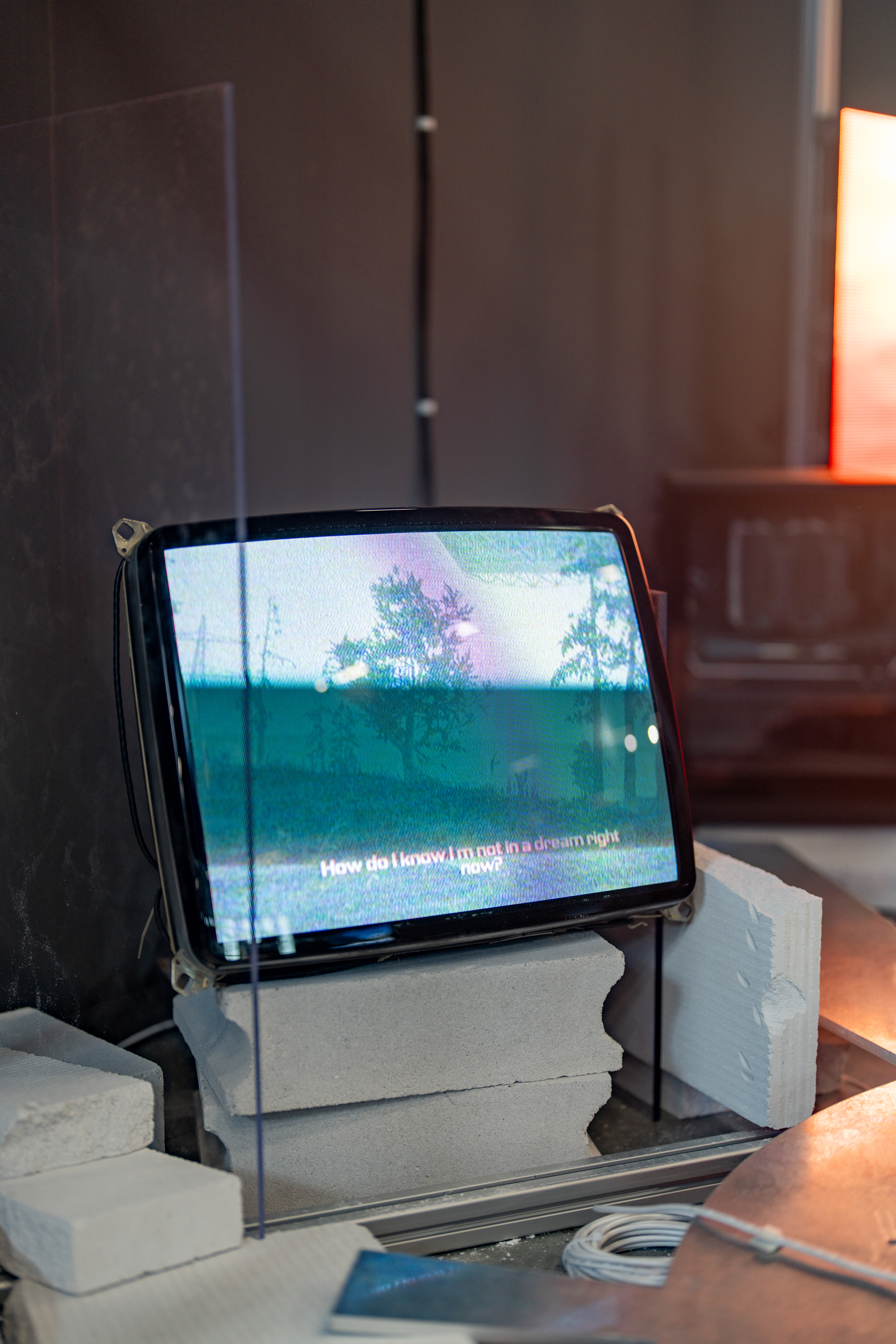 Materials: AI agents, LED screens, Radio signal, Computer, Analogue TV, Aluminium, Cinder blocks